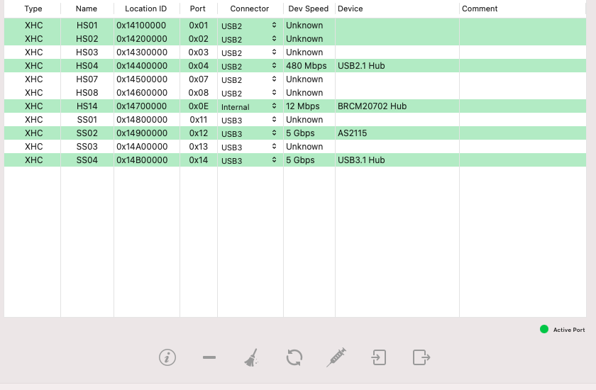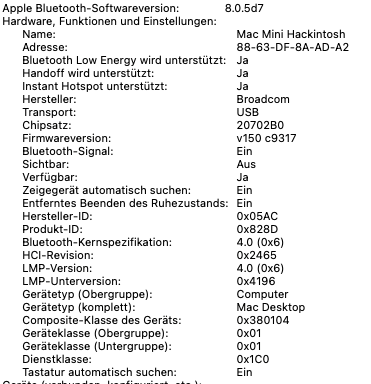 In Hackintool sieht man, dass der Port (HS14) nach dem Booten nicht belegt ist. Wifi funktioniert aber. Ab und zu aktiviert sich Bluetooth nach dem Standby aber weder Airdrop noch Handsoff funktionieren (es werden keine anderen Geräte angezeigt).