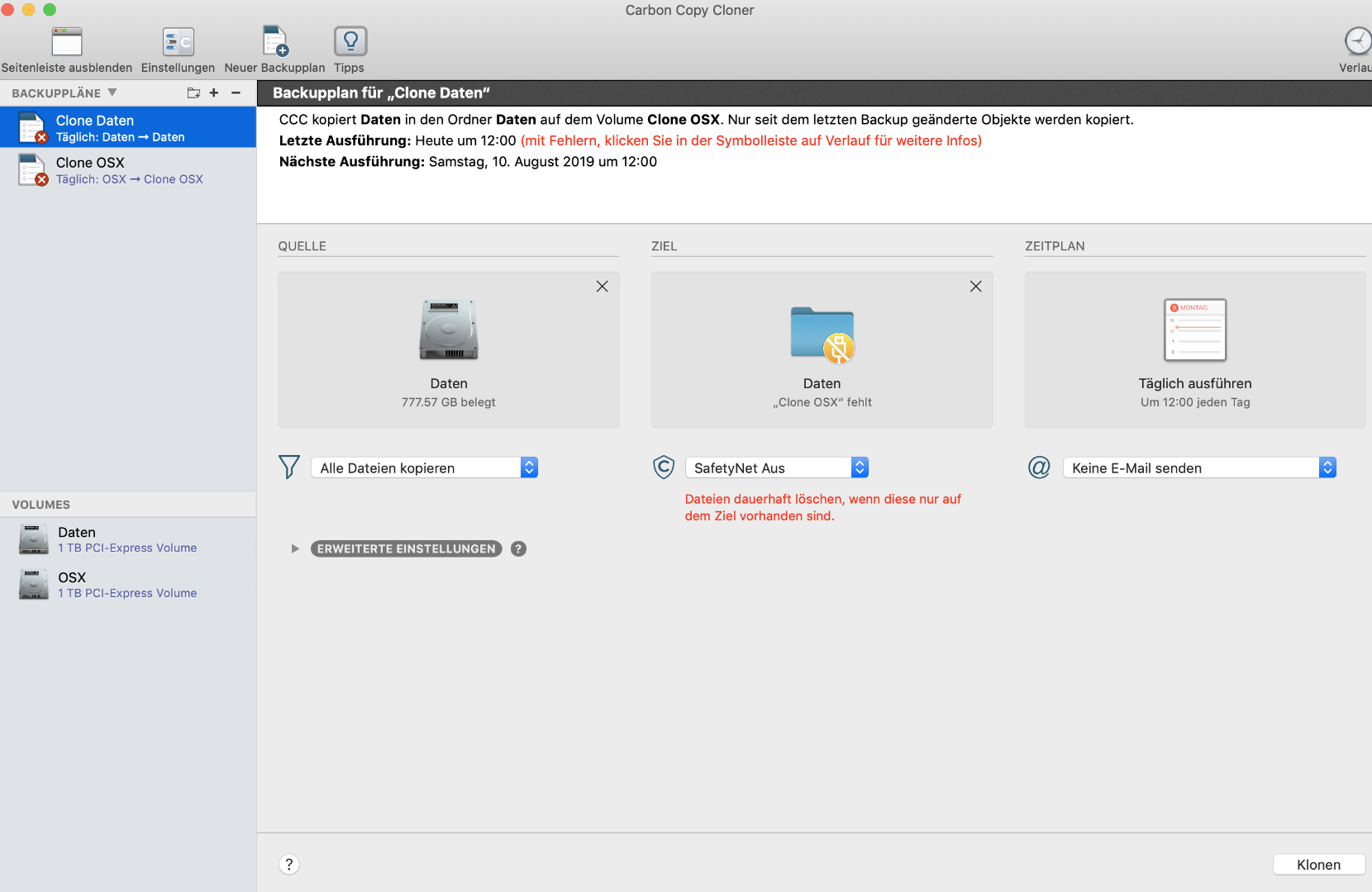 Starte nun CCC und bekomme gleich einen Fehler. CCC kann von OS und Daten keinen Clone erstellen da der Datenträger «Clone» so heisst meine SSD 2 TB, nicht gefunden werden.