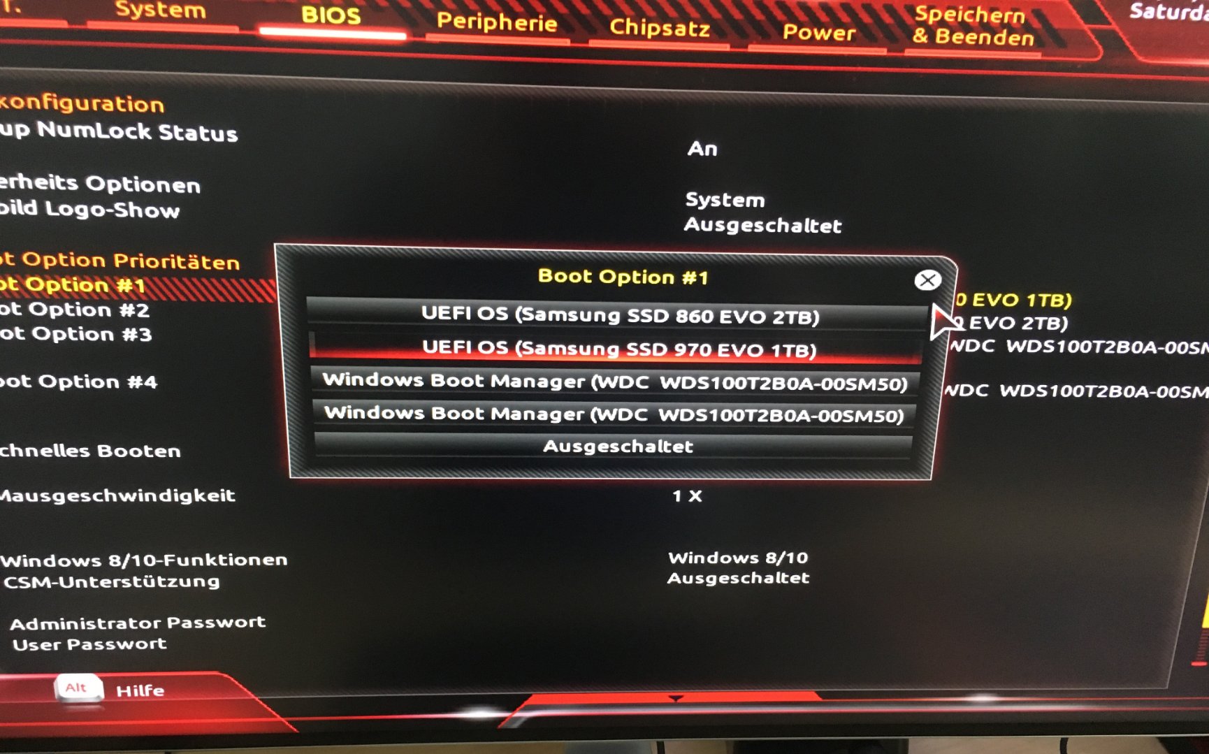Im Bios F7 sind die SSD’s zu sehen, SSD 860 und WDC die 970 ist eine NVME. Komischerweise zeigt es mit die 2x 970er NVME auch nicht an.