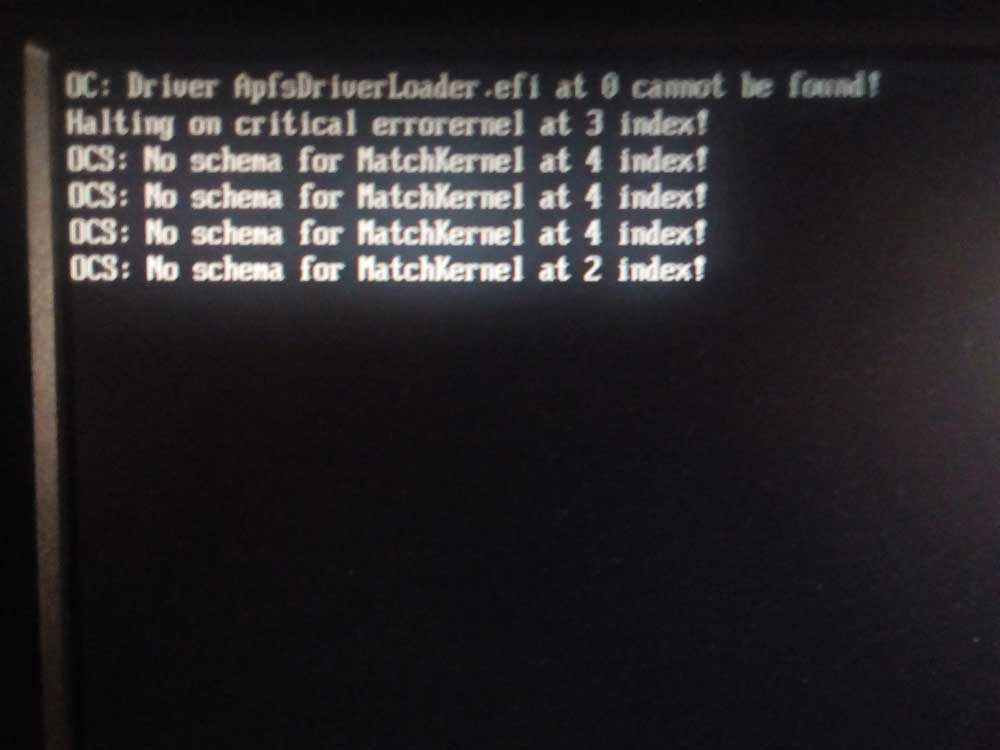 • MatchKernel gibt's nicht mehr. Du hast eine neue OC Version aber eine alte config.plist und ApfsDriverLoader.efi fehlt im Ordner /OC/Drivers