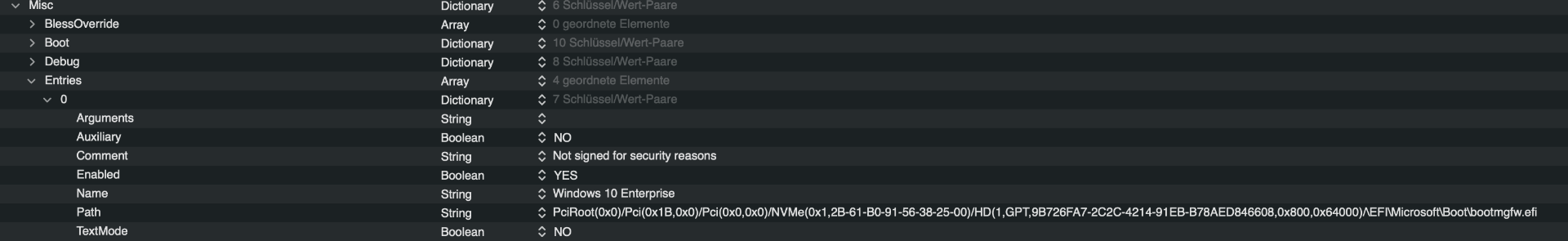 • Kalypso478 Nein, nicht in BlessOverride, sondern in Misc/Entries (s. Screenshot). Du musst zuvor den Pfad für dein Windows ermitteln - dies tust du entweder über die UEFI-Shell ( karacho hat hier eine Anleitung dazu geschrieben), oder entimmst ihn einem richtigen Debug-Log, falls du zufällig ein aktuelles da haben solltest.