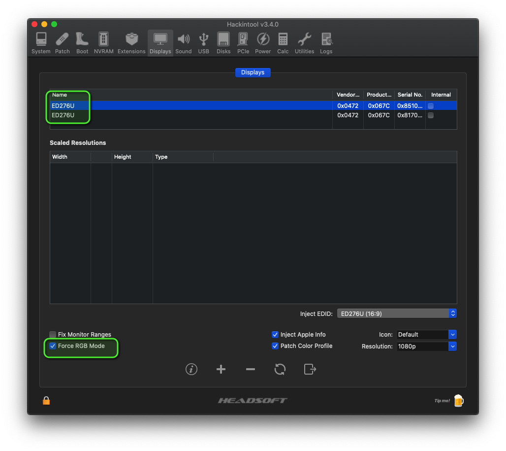Oder mit dem Hackintool (ehemals Intel FB-Patcher) , wenn du unter "Displays" den Ausgang für den jeweiligen Monitor am HDMI auswählst, den "Force RGB Mode" anklickst und dann über den Export-Button einen "DisplayVendorID-XXX"-Ordner erstellen lässt.Den kannst du dann n das Verzeichnis /System/Library/Displays/Contents/Resources/Overrides kopieren.