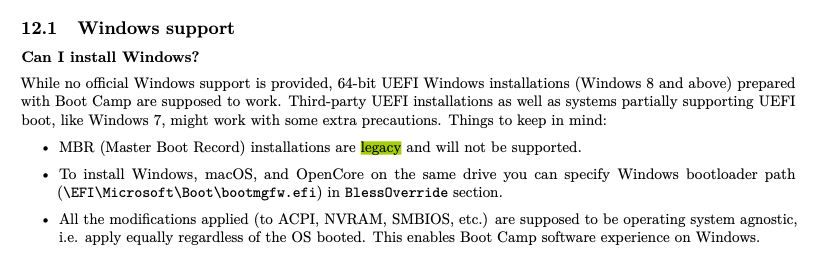 Damit wird im SMBIOS unter MacOS der volle Model Identifier hinterlegt, ABER und Windows bleiben jetzt die Originalwerte erhalten. Ich boote also mit OpenCore in Windows 10 und habe im SMBIOS Dell XPS13 stehen, daher sagt mir auch die Setup.exe, dass dieses Mac-Modell nicht unterstützt wird und eine volle Treiberinstallation (inkl. Trackpad z.B) ist nicht möglich.