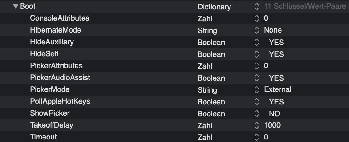 Es ist aber jetzt seit 059 so, ich denke es hat mit dem HideSelf zu tun. Was ist bei 059 jetzt anders das es diesen Eintrag nicht mehr braucht ? Warum zeigt er mir mit 059 die EFI an was er mit 058 wahrscheinlich durch HideSelf YES nicht gemacht hatte ? Oder ist mein Fehler mit 059 ganz woanders passiert beim abgleich mit der Sample.plist...