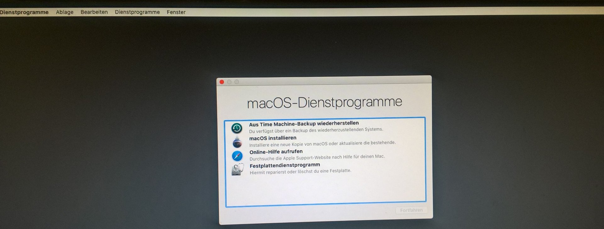 Mit ihm komme ich nun problemlos bis zur Partitionsauswahl. Egal was ich hier wähle (Catalina-Installer oder meine fertige Catalina-Installation aus Clover-Zeiten), der Prozess bleibt immer an dieser Stelle hängen: