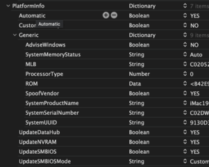 Weiß jemand zufällig, ob und wie man die Daten aus PlatformInfo > Generic von OpenCore in Clover übernehemne kann, ohne das macOS motzt von wegen Apple-ID? Denn das ist ja nur ein winziger Teil aller möglicher Daten, die man dort eintragen kann. In Clover stehen ja auch viel mehr Angaben, ähnlich wie in der OC sample-full.plist.
