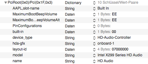 • Nur ein Beispiel. Teils sind diese Werte eh vorhanden – und wenn ja, dann werden die eh nicht überschrieben zu diesem Zeitpunkt – teils ist es nur "Kosmetik", um so im Systembericht unter PCI-Geräte aufzutauchen. Mitunter sind es spezifische Einträge, die macOS helfen, den richtigen Treiber mit den richtigen Optionen zu verwenden, oder eine bestimmte Reihenfolge (location 1) einzuhalten, oder Reihenfolge von USB-Controllern (USBBusNumber 0x02), oder zusätzliche Infos für Apples Systemtreiber, dass dieses Gerät trotz andere Adresse genauso funktioniert wie eine bestimmte bekannte (compatible pci144d,a804) und und und …