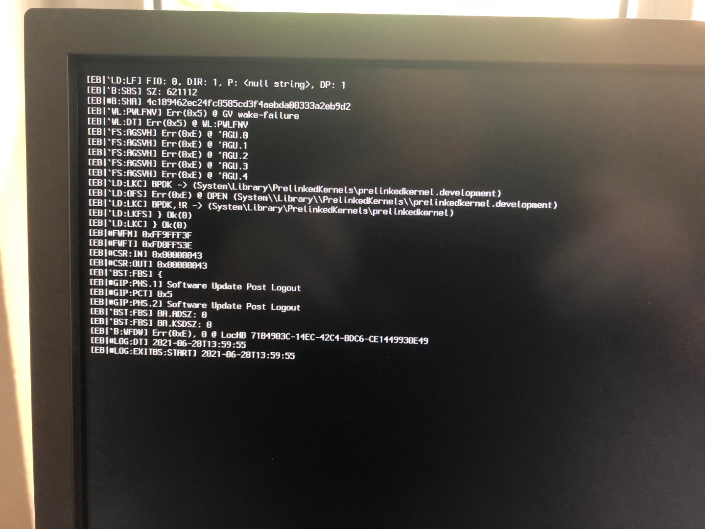 Das mit dem Prelinkedkernel.development ist wohl nicht so schlimm, denn der Boot lt. BootLog läuft erstmal weiter. Habe noch kein Feeling für die ProtollEinträge.