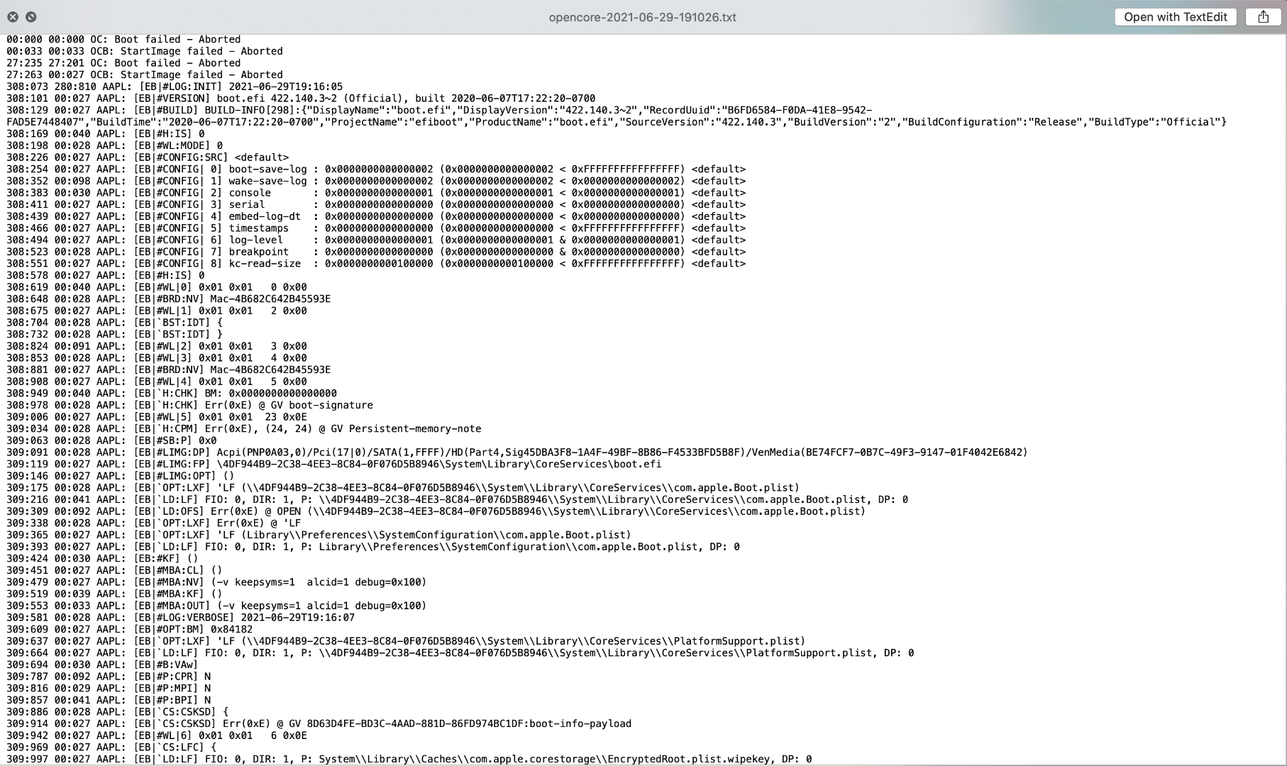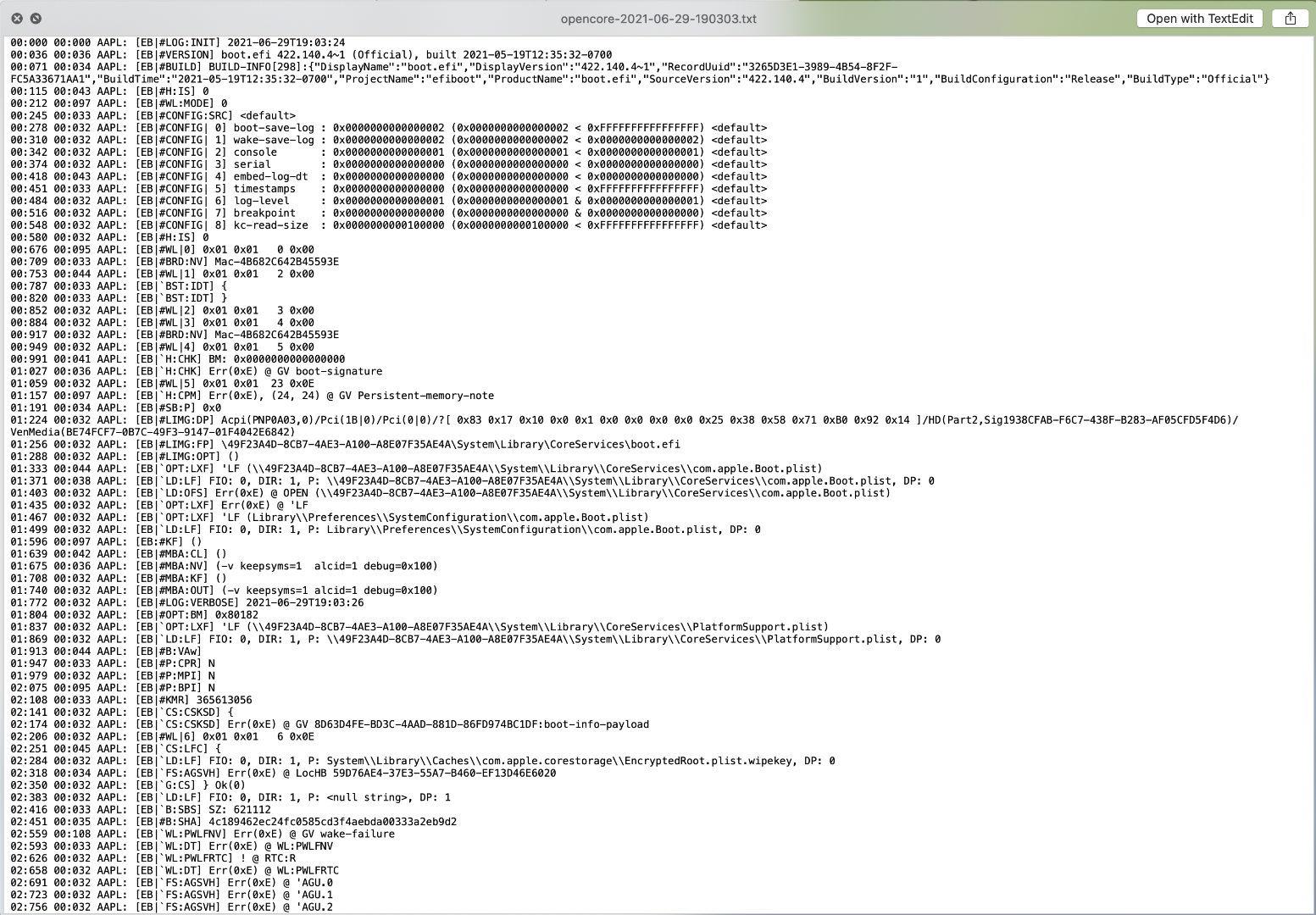 Habe Dortania nochmal durchgeackert und auch die OC-Referenz. Die Protokollstrategie hab ich nun nochmal überprüft und überarbeitet. Das Log wird nun geschrieben. Sowie es ausschaut ist da so gut wie alles drin.