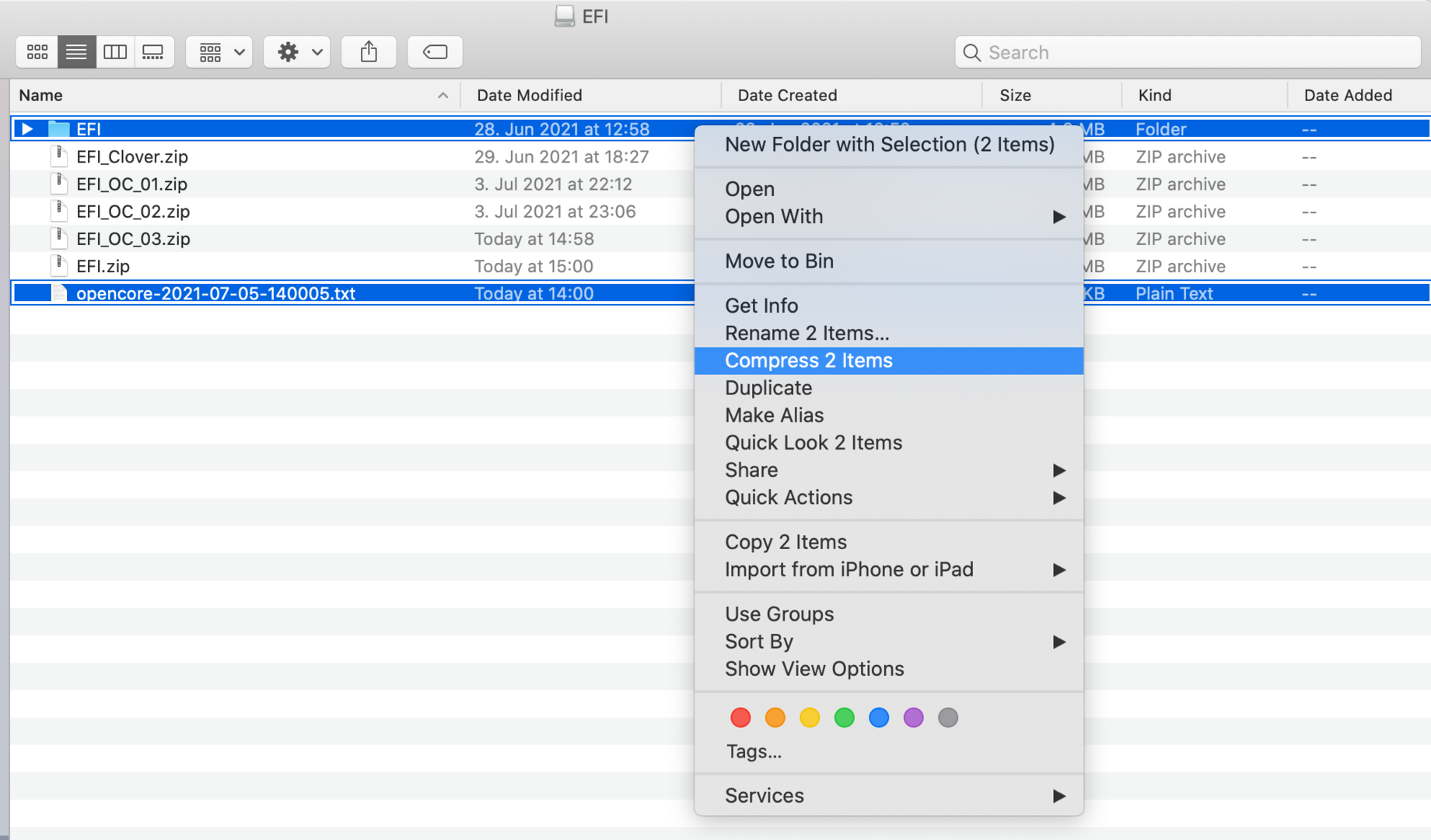 Habe folgendermassen gepackt. (Damit der bootlog mit drin ist, also nicht auf dem höheren Directory-Level). Dann gibt es eine "Archive.zip". Die habe ich umbenannt, da ihr wahrscheinlich eine EFI.zip erwartet. Normalerweise würde beim Auspacken dann ein Directory "Archive" entstehen. ..