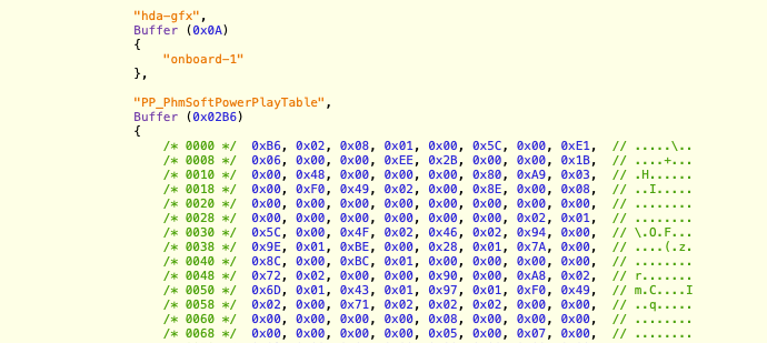 • iTTT Die PowerPlay Table wird mit der Property "PP_PhmSoftPowerPlayTable" als Device Property übergeben. Wie oder mit was du diese Properties zur Grafikkarte bringst ist für die Funktion unerheblich. Sowohl Clover als auch OpenCore können Device Properties übergeben. Alternativ geht es auch mit einer Codeless Kext oder über eine SSDT. Für letzteres müsste man allerdings das Format umwandeln.
