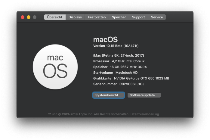 Musste aber von Mojave upgraden, da ich unter Catalina Beta 1 zurzeit keine Systemeinstellungen ändern kann. Sobald etwas nach 'nem Password fragt, stürzt es direkt ab und lande dann wieder auf der Startseite mit den ganzen Symbolen.