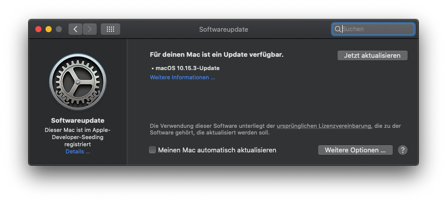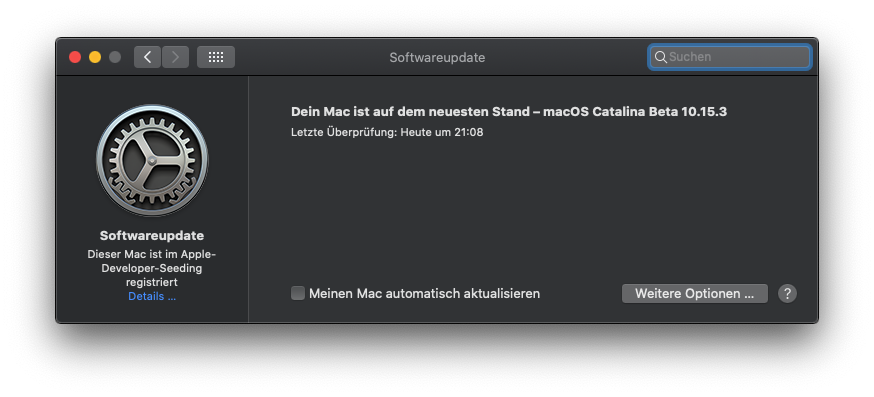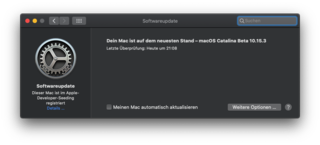 • Und schon wieder war mein Catalina im Beta-Seed gelandet und ich musste erneut (via TreeSwicher) auf Developer Seed umschalten. Nun läuft der DL,