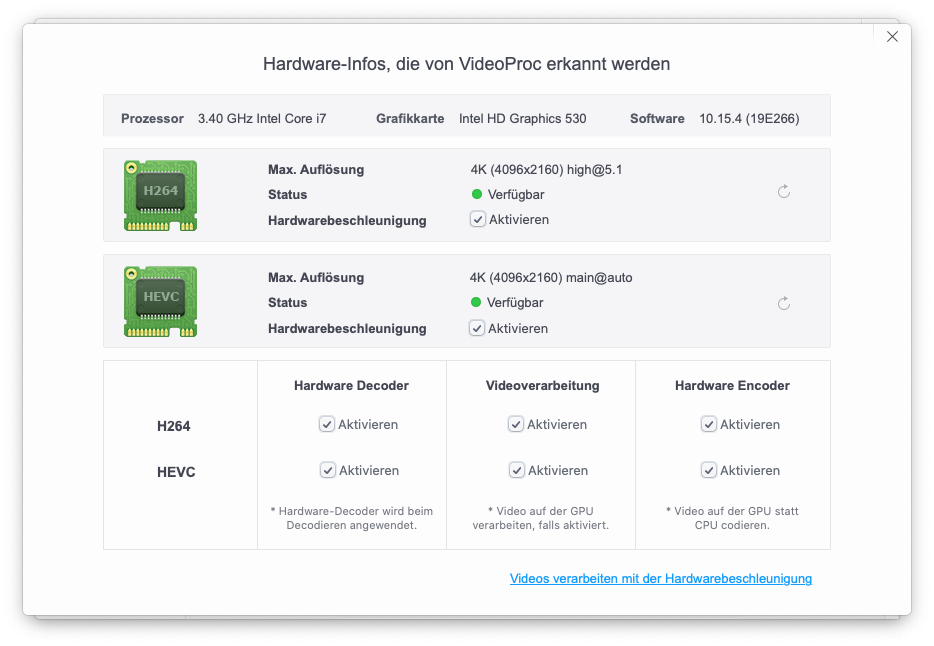 Ausserdem ist mir aufgefallen wenn unter 15.3 im Config.plist / DeviceProperties / irgend was für Graphic (PciRoot(0x0)/Pci(0x2,0x0)) definiert wurde fiel der HEVC Codec mit der VideoProc aus. Also hatte ich den immer weggelassen.