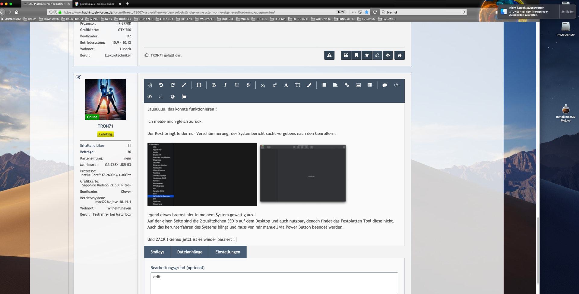 Ich warte jetzt noch den Download ab, iTunes beenden und die SSD danach in Ruhe lassen, sehen ob diese dann wieder automatisch ausgeworfen wird.Sollte das der Fall sein, werde ich deinen nächsten Tipp in Angriff nehmen mein lieber yoyo268 :)