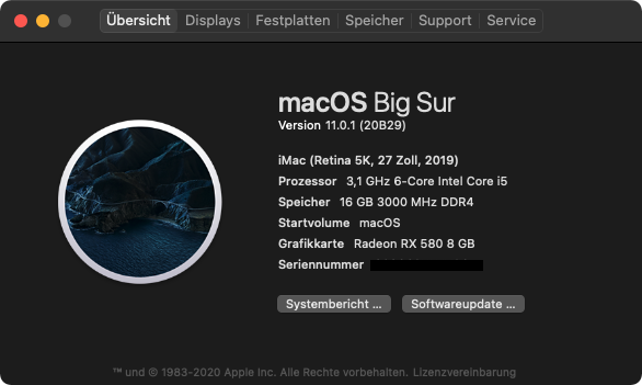 • macOS Big Sur Version 11.1 (Build 20C69), ab 04.02.21 11.2 (Build 20D64)