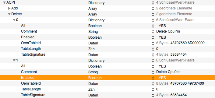 Es handelt sich um die Rubrik "ACPI" in der "config.plist", dort findest du unter "Delete" zwei SSDT, die entfernt werden sollen. Die Daten schliessen auf den zweiten Eintrag "Delete Cpu0Ist". Diese SSDT ist offensichtlich gar nicht in deiner ACPI vorhanden (oder zumindest die gesuchte "OemTableId"), entsprechend gibt es die Fehlermeldung "Failed to drop" bzw "Not Found".