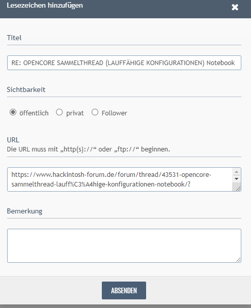 • Tipp: Fügt euer Notebook zum Hardware Center hinzu, mit link zu dem Post mit der EFI... Achtet darauf, dass nicht mehrere Threads fürs gleiche Modell existieren ;)