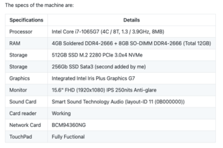 Thunderbolt/ USB-CIntel JHL7540 / Titan Ridge 2C 2018🔶 PartiallyUSB-C charging works. Thunderbolt devices work, but USB-C device are only working with USB 2.0 speed if they have not been attached prior to boot. External monitors via USB-C to DisplayPort adapter are working fine.