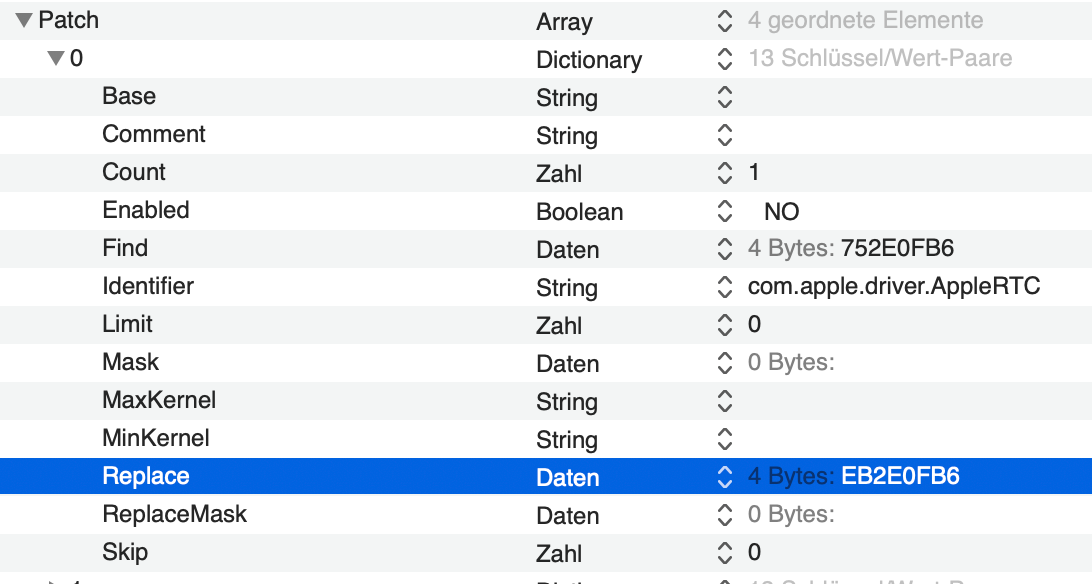 Sind aber nicht aktiv (enabled no), in der „Sample.plist“ nur als Beispiel drin, wie man eben „patcht“, welche Parameter gibt es etc. Das gibt es ähnlich auch in Clover. Kannst du komplett entfernen, macht ja eh nix.