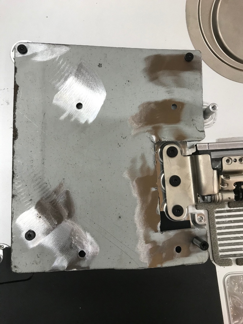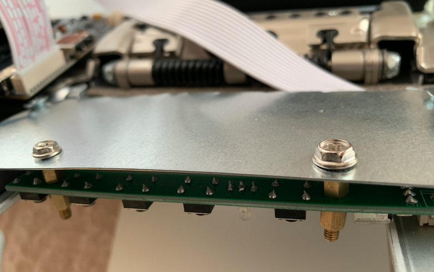 Außerdem fand ich die Lösung mit herausziehen des Bedienteils nicht gut, weshalb ich ein Blech zurechtgeschnitten, die Ecken abgefeilt und an vorhandene Löcher angepasst habe (Fixierung per M-Gewindeschrauben). Hier hätte ich gerne ein etwas stärkeres Blech genommen, da es bei Druck auf die Tasten etwas nachgibt; es funktioniert aber gut. Das Bedienteil selbst habe ich wegen des geringen Lochdurchmessers mit 4 Abstandhaltern für Mainboards und entsprechenden Schrauben fixiert.