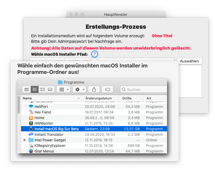 Natürlich kann die Installerapp auch woanders liegen aber ich gehe jetzt davon aus, dass zuvor der Installer mittels ANYmacOS erstellt wurde.