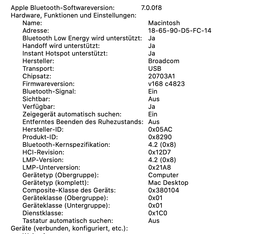 1. Bei der internen Apple Bluetooth/ WLAN Karte funktioniert der Bluetooth Teil nur, wenn ich die Karte an den USB 2.0 Port auf der Rückseite des Mainboards anstecke (Screenshots). Wenn ich die Karte an den internen Port anstecke, leuchtet zwar die 2. grüne Bluetooth power LED, aber "Bluetooth nicht verfügbar". Unter Mojave mit eineme Asus Prime Z370-A hat Bluetooth am internen Anschluss funktioniert. Das Kabel sollte ok sein, das habe ich zur Sicherheit getauscht und auch die Kabel auf den 2. USB Port gelegt, keine Änderung.