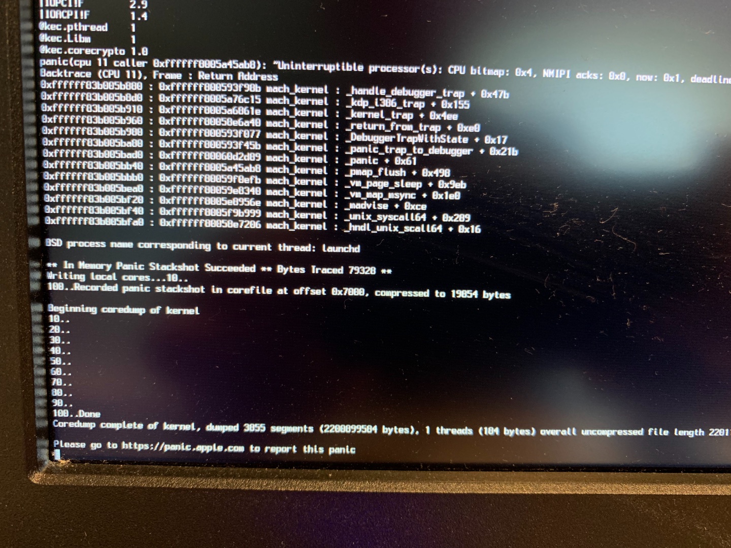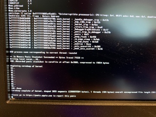 2. Beim Herunterfahren, bzw. bei einem Neustart aus dem Menu bleibt der MAC mit einem Kernel Panic hängen. Allerdings hat das schon mal kurzzeitig nach dem Update funktioniert. Der Ruhezustand scheint zu funktionieren.