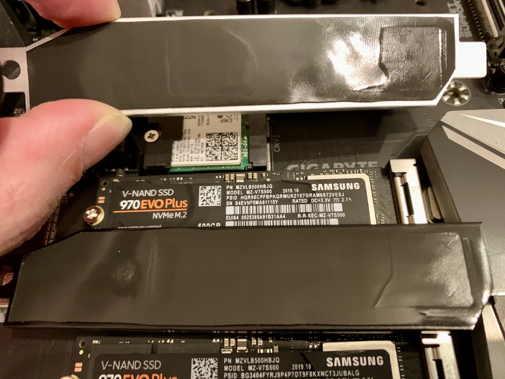 Ich habe gerade nochmal die Kühlblöcke der beiden Samsung "970 EVO Plus NVMe M.2"s ausgebaut. Dabei ist mir aufgefallen, dass bei beiden nur jeweils die beiden äußersten Chips Abdrücke in den Wärmepads hinterlassen haben. Von den beiden mittleren Chips sieht man nix in den Pads. Ich werde mir morgen mal etwas dickere Pads besorgen...