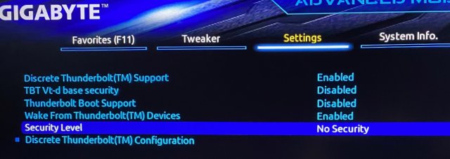 Wegen Thunderbolt bitte grundsätzlich im Bios auch nochmal nachprüfen, ob bei Thunderbolt auch wirklich "No Security" ausgewählt ist und nicht "User Authorization". Allgemein bitte alle Bios-Einstellungen nochmals mit denen aus dem ersten Post abgleichen. Wenn die Thunderbolt-Einstellungen abweichen, geht es möglicherweise unter Windows, unter macOS aber nicht unbedingt.