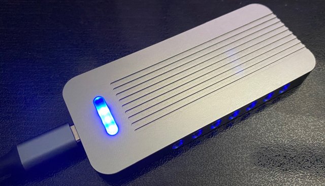 Die blaue LED im letzten Foto geht z.B. schon während des Bootens einer MacOS Installation aus, unter Catalina oder Mojave geht diese auch gleich nach dem Anstöpseln wieder aus und ist auch nicht ansprechbar.