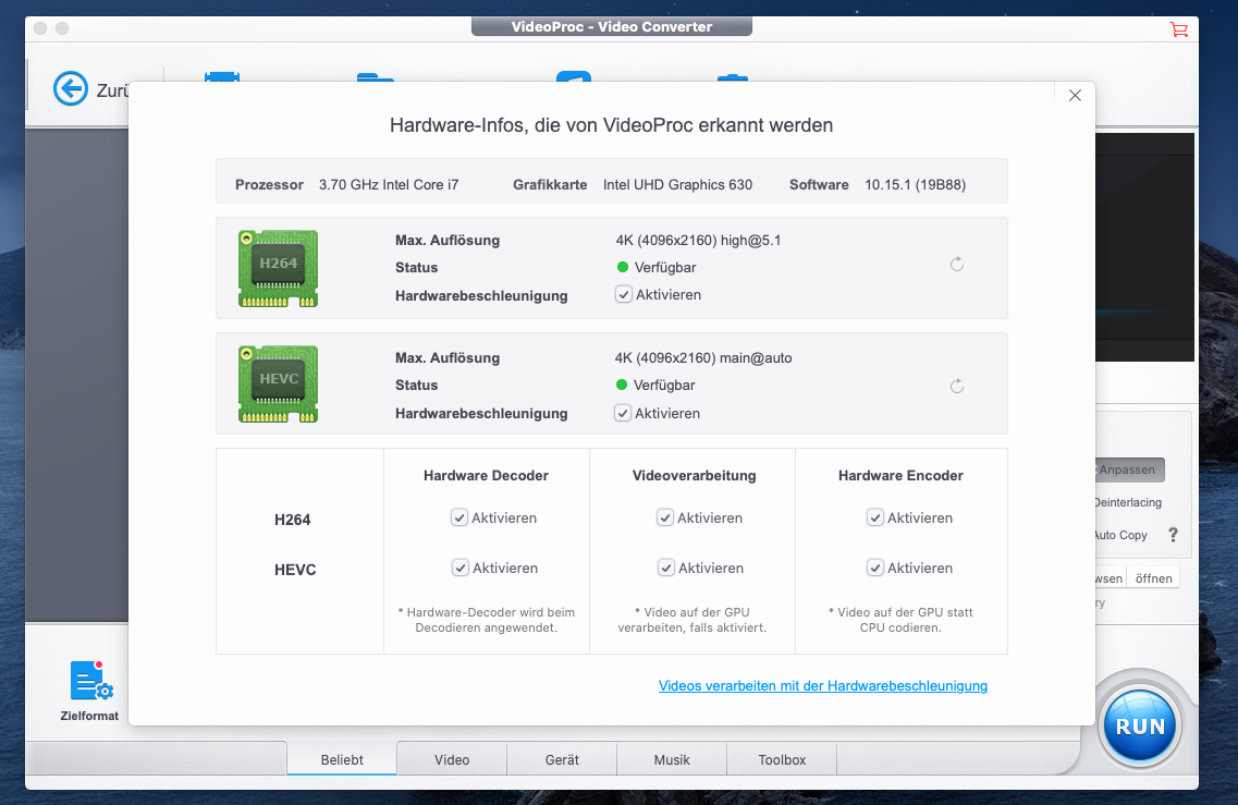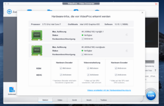 Mit dem HEVC-8-Bit-Encoding ist es genauso wie unter Mojave: Internal Graphics muss im