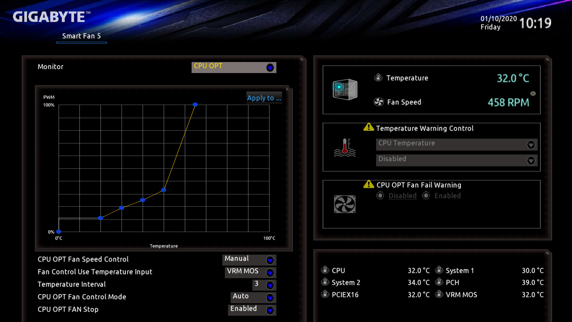 Wie du siehst, habe ich alle Sensoren (außer bei der Pumpe und den Radiator-Lüftern, die natürlich auf den CPU-Sensor reagieren) auf VRM MOS gestellt.