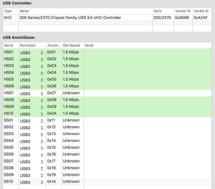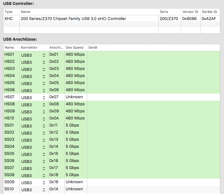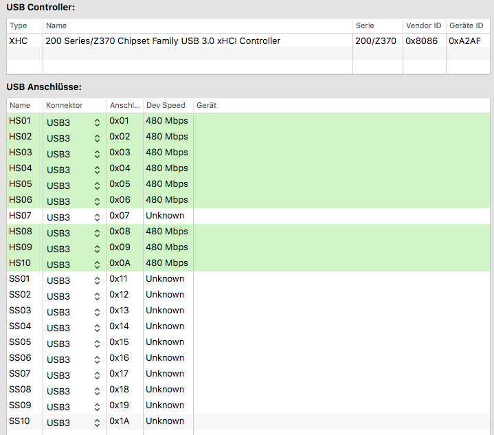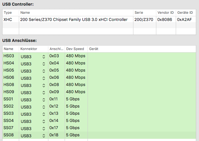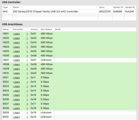 10.12.6, wie schon gesagt. Habe deinen Hinweis mit USB HS10 und SS10 zu spät gelesen. Den USB2 Header und den USB3 Port auf dem MoBo habe ich im BIOS deaktiviert, dann die nicht genutzten Ports mit uia_exclude=HS01;HS02;HS07;HS10;HS11;HS12;HS13;HS14;SS05;SS06;SS09;SS10;USR1;USR2 ausgeklammert. Das sieht dann jetzt so aus: