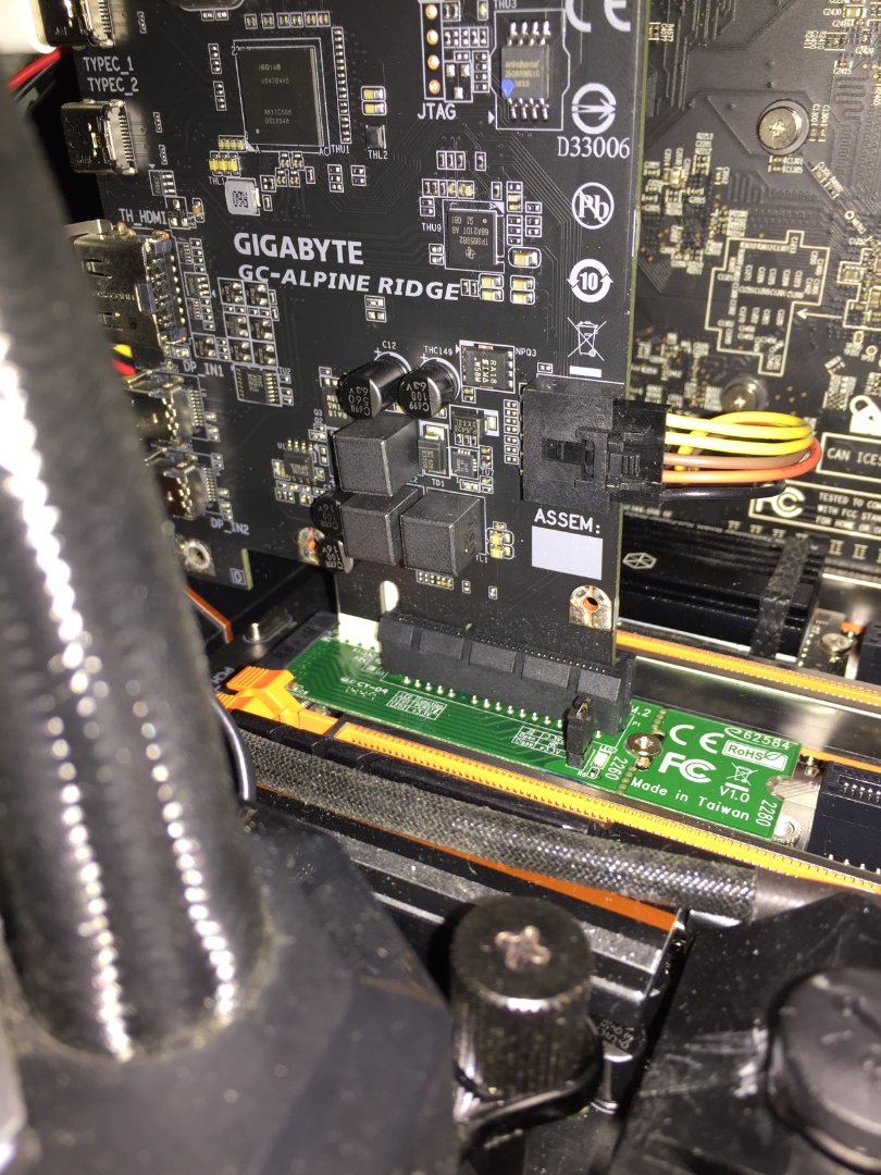 das Ding hat zwar einen Thunderbolt-Header, erkennt auch die USB-C Anschlüsse der GC Alpine Ridge Karte - macht aber um's verrecken kein Thunderbolt.