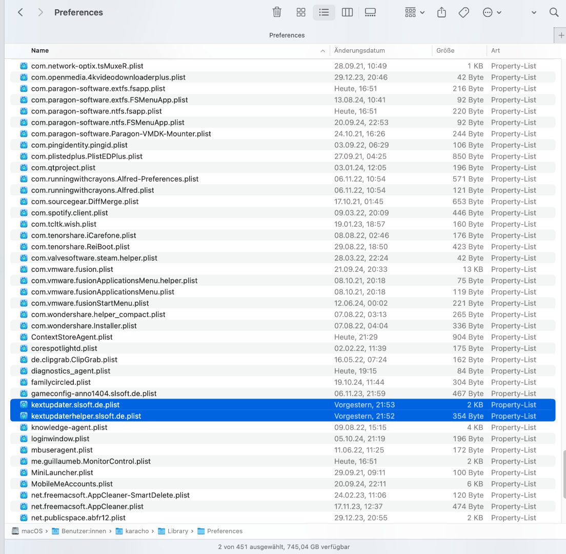 Ich habe durchaus nach kextupdater gesucht, außer com.apple….. beginnend ist bei mir nichts drin, überwiegend schon Jahre altes Zeug. Außerdem einige Unterordner die auch nicht das Gesuchte enthalten 🤷‍♂️
