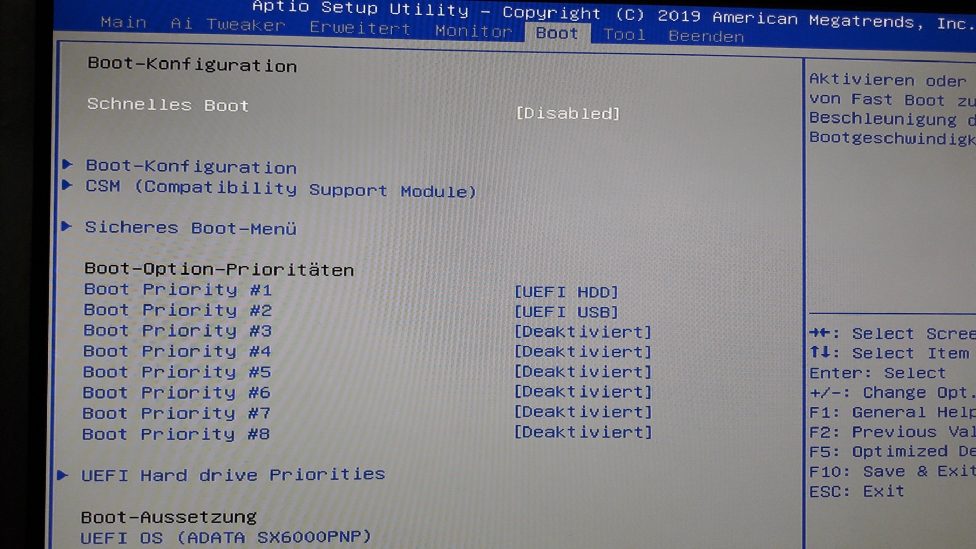 Ich habe nur eine ADATA SX6000Pro im M.2 Slot installiert, alle anderen SATA Ports deaktiviert. Du musst die SSD unter Boot Aussetzung eintragen.Ich gebe zu, dass ich, obwohl schon zig PC's zusammengestellt und BIOS geupdatet habe, mich hier auch schwer getan habe. Nur Mut...dat geit!