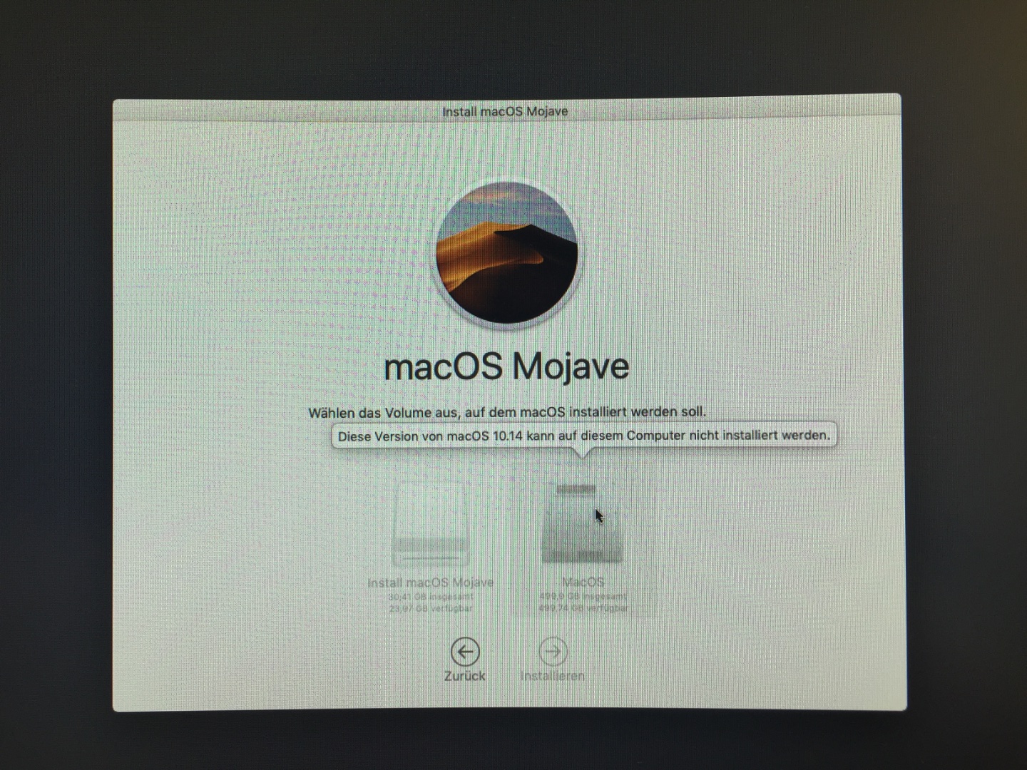 EDIT2: Wenn ich mit der Maus über die Platte gehe, erscheint der Hinweis. "Diese Version von MacOS 10.14 kann auf diesem Computer nicht installiert werden."