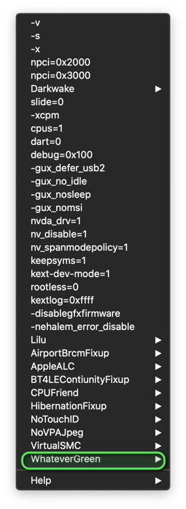 entweder manuell hinzufügen oder aber durch Klick der rechten Maustaste, im "Arguments"-Fenster des Clover Configurators, und der folgenden Auswahl: