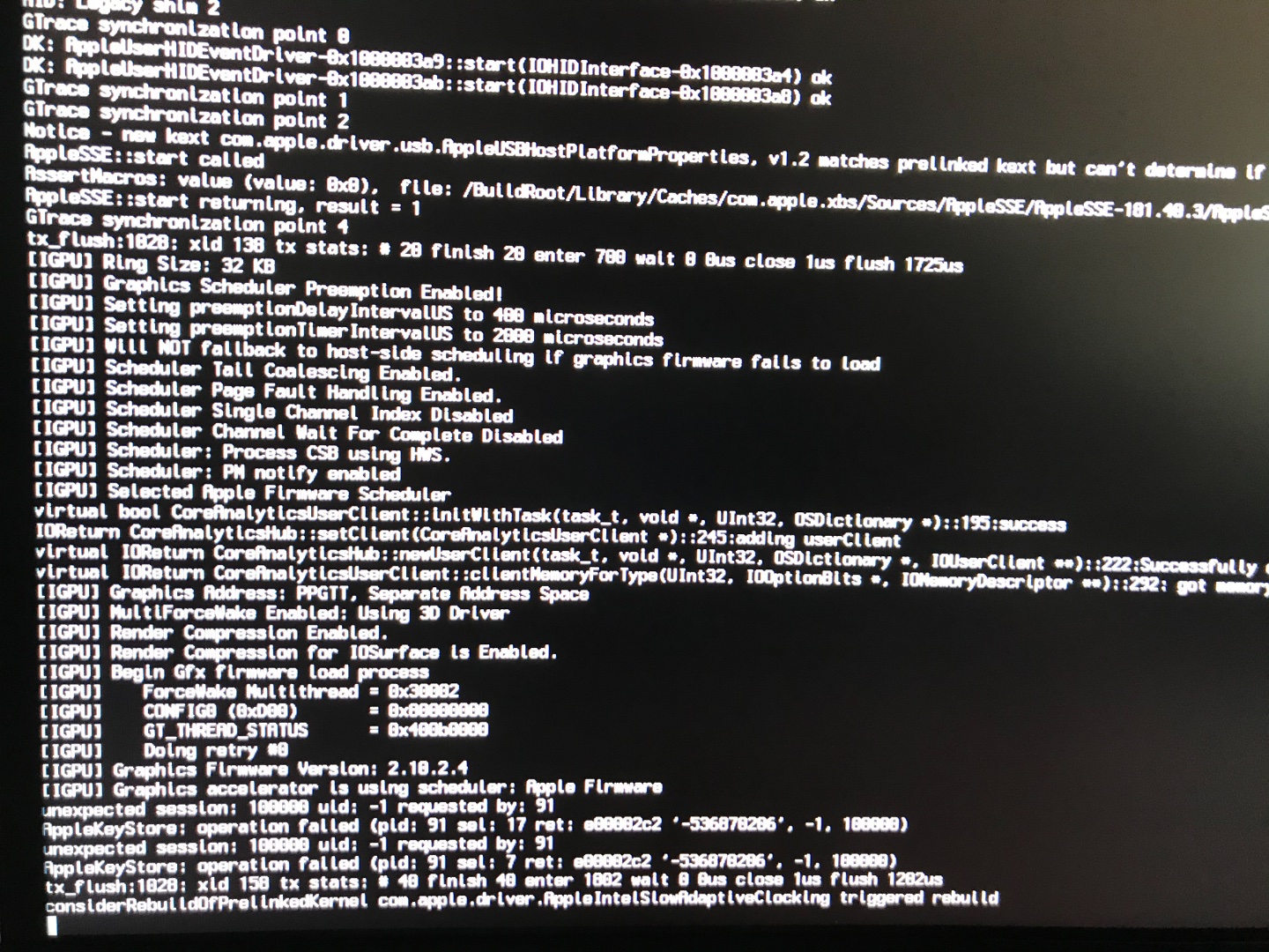 Anbei der Screenshot des boot logs nachdem ich mit der option -verbose gestartet habe. Interessant ist, dass trotz der Option irgendwann das Apple boot logo erscheint. Der Mauszeiger ist auch da und dann gehts nicht weiter.