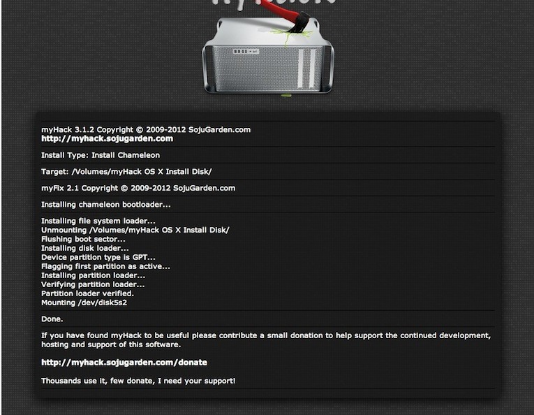 (2) Kannst Du auf dem Rechner und mit dem OSX, mit dem Du myHack aufgespielt hast, nochmals versuchen den Bootloader auf den Stick zu installieren. (Das ist - glaube ich - der vierte Menue-Punkt: >Install chameleon<. Als Zielpartion mußt Du den Stick auswählen.