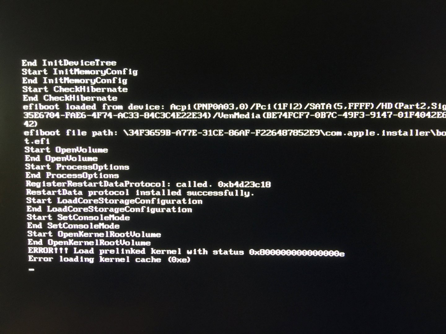 Hallo Leute, bei der Installation von Mojave (komplette Hardwareconfig siehe Signatur unter System 1) stoße ich auf einen prelinked kernel cache Error (0xe).