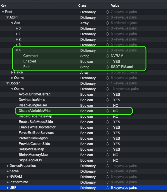Läuft bei mir. Z390 Designare mit Clover. Ich verwende FwRuntimeServices und OCQuirks. Hab meine OCQuirks.efi entsprechend dem Screenshot von al6042 angepasst, die EmuVariable.efi sowie die nvram.plist gelöscht und auch die Clover-RC-Skripte aus dem /etc-Ordner entfernt. Die SSDT-PM hab ich in CLOVER/ACPI/patched kopiert. Das war’s.