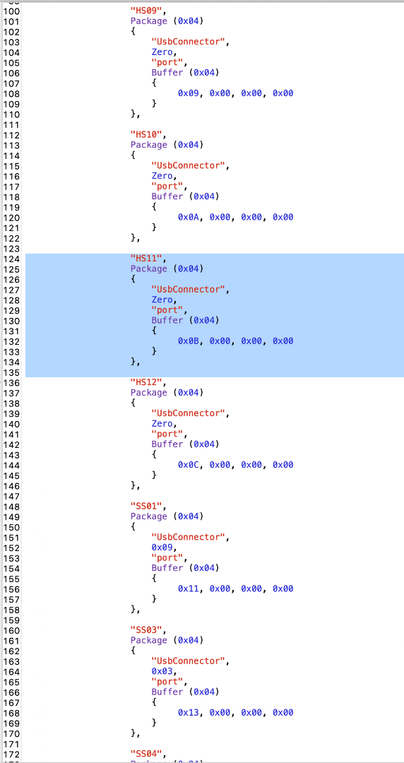 • HS12 ist in der SSDT aus meinem Ordner sowieso auf Internal (gehört ja schließlich zum internen USB-2.0-Header), insofern wäre in dem Fall dann die einfachste Lösung, ihn einfach aus der SSDT rauszuschmeißen.
