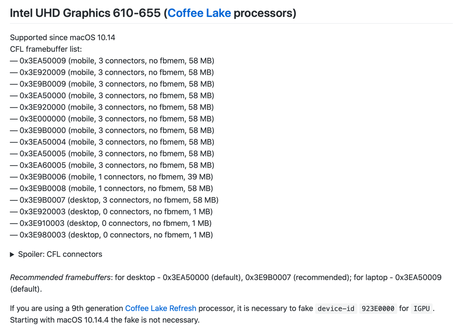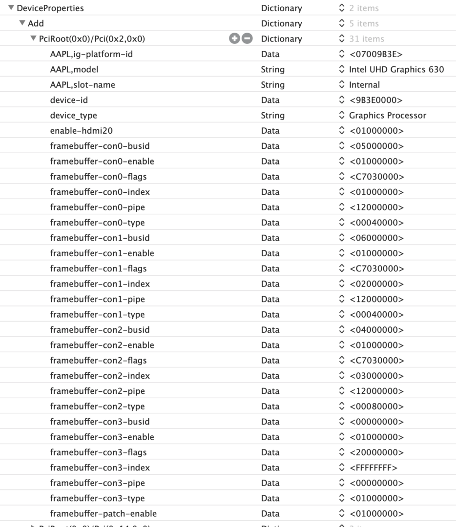So, mit den Infos aus dem Whatevergreen Manual von hier habe ich nun die korrekten Werte für meine Coffee Lake Core i5-8500 UHD630 gefunden und meine config.plist entsprechend angepasst.