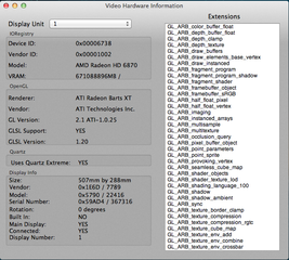 Zeigt Informationen zur verwendeten Grafikkarte und zum Monitor an. Besonderheit: Man sieht ob Quartz Extrem Aktiviert ist, oder nicht.