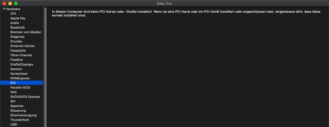 Komischerweise ist in dem PCI Reiter auch keine Grafikkarte (RX 580) aufgelistet, diese funktioniert jedoch einwandfrei.