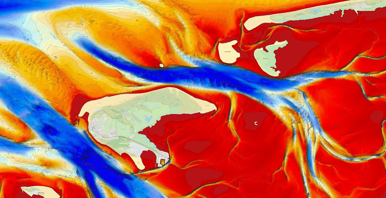 An so einer Karte rechnet die Maschine rund eine Woche (also nicht für diese winzigen Ausschnitte, sondern für die volle Fläche). Im Nachgang werden dann noch Vektordaten für alle Seezeichen in der Nordsee berechnet - das geht aber vergleichsweise fix.