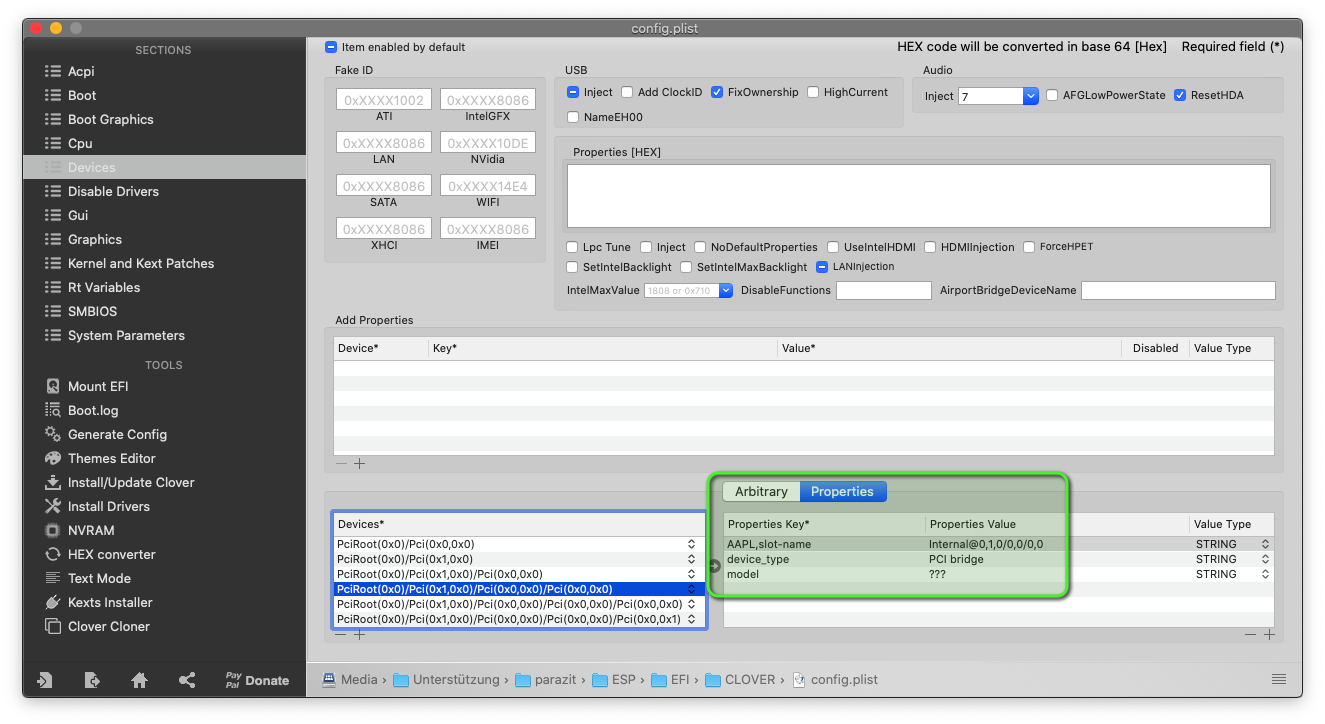 • Das liegt an den Angaben in der config.plist, unter "Devices"->"Properties".