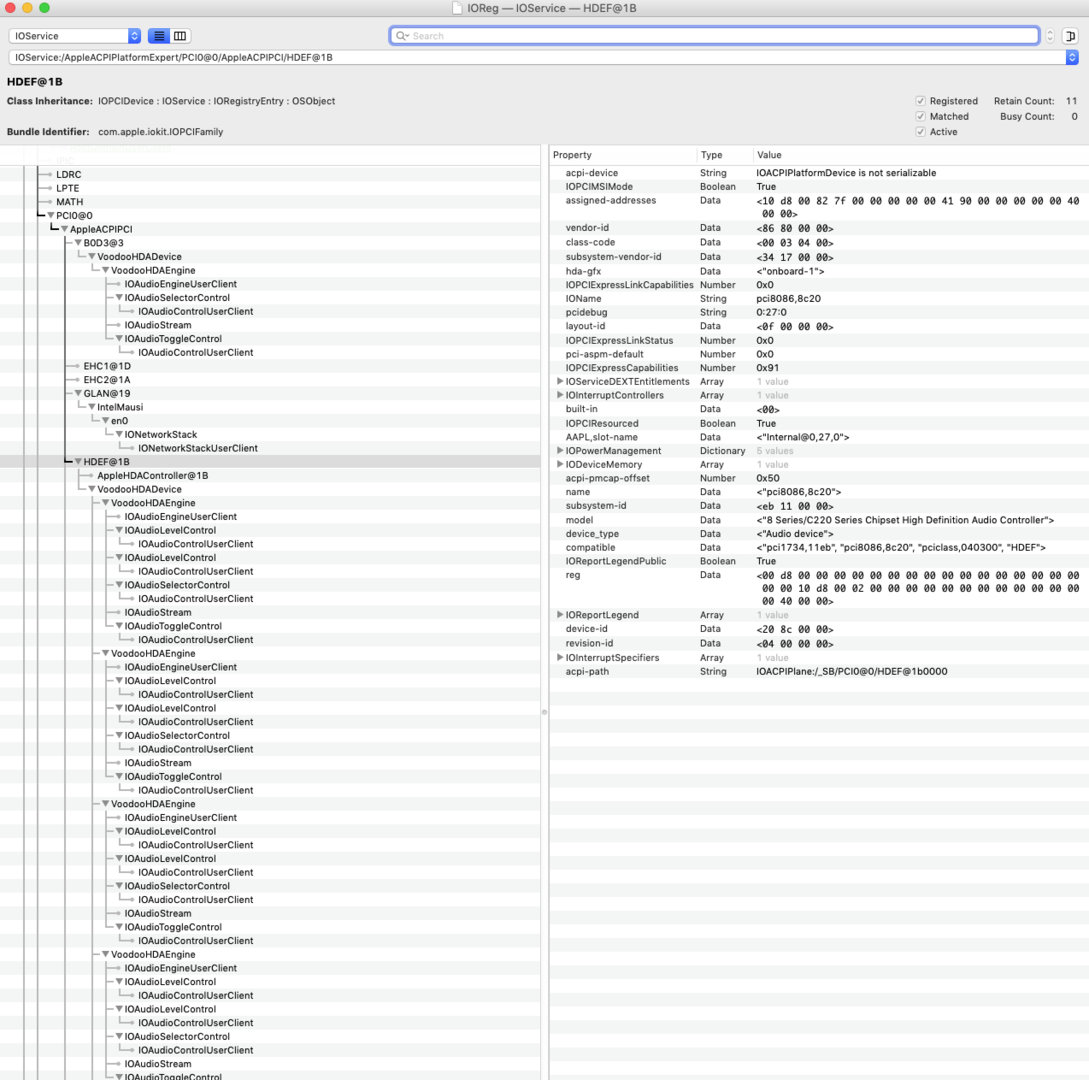 Fast alle Intel-PC's, einschließlich aller real Mac's, haben das Onboard-Audio auf dem Device 1B. Seine gepostete System-DSDT zeigt dies auch ganz klar. Onboard-Audio ist immer das Device HDEF: